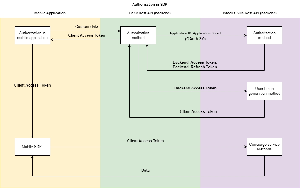 The Bank REST API backend sends a Backend Access Token to the Infocus SDK REST API backend and passes user ID (SHA-256 hash of mobile phone number or alternatively, Bank internal user ID with required activation service process) and receives a Client Access Token.